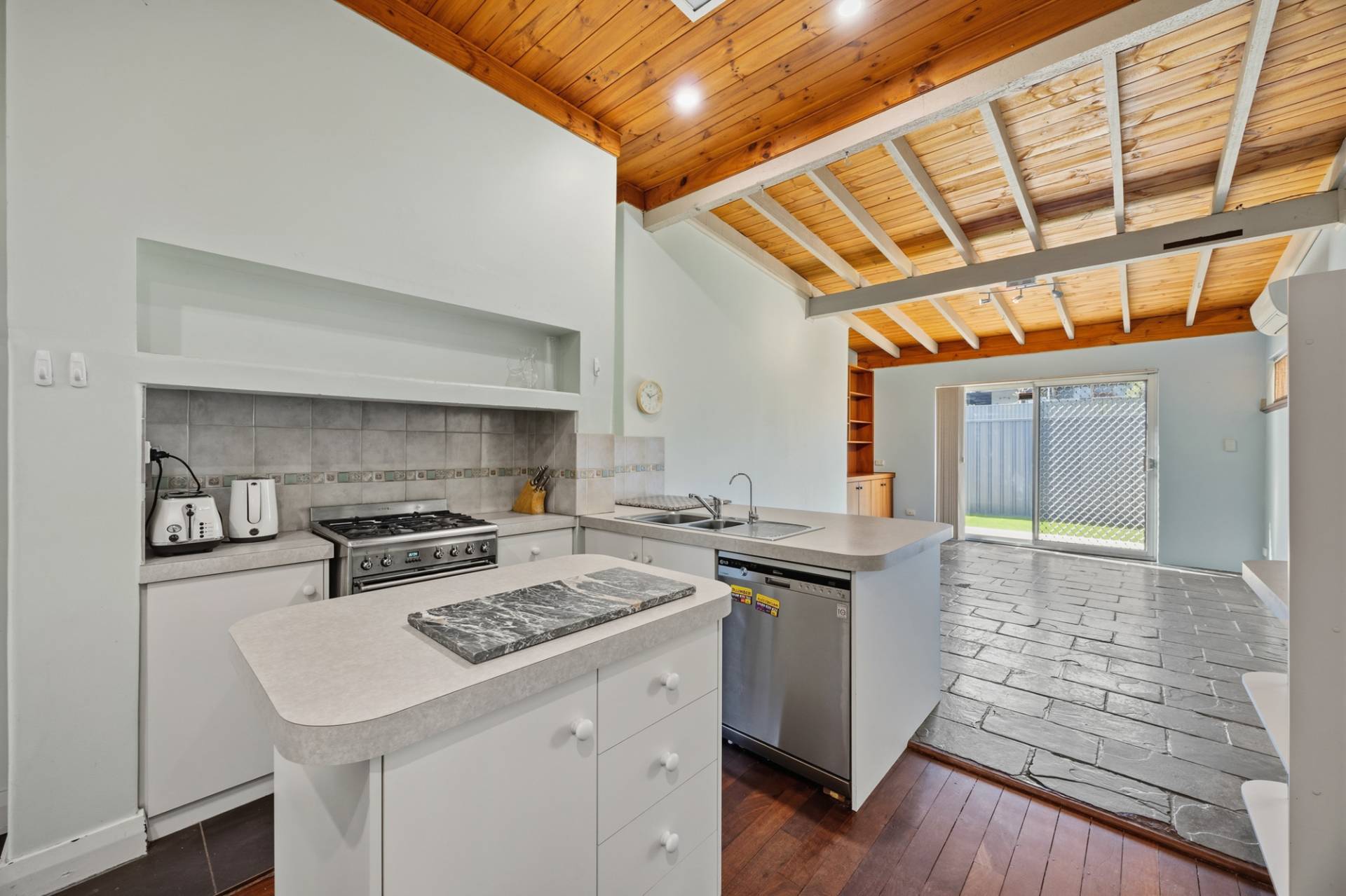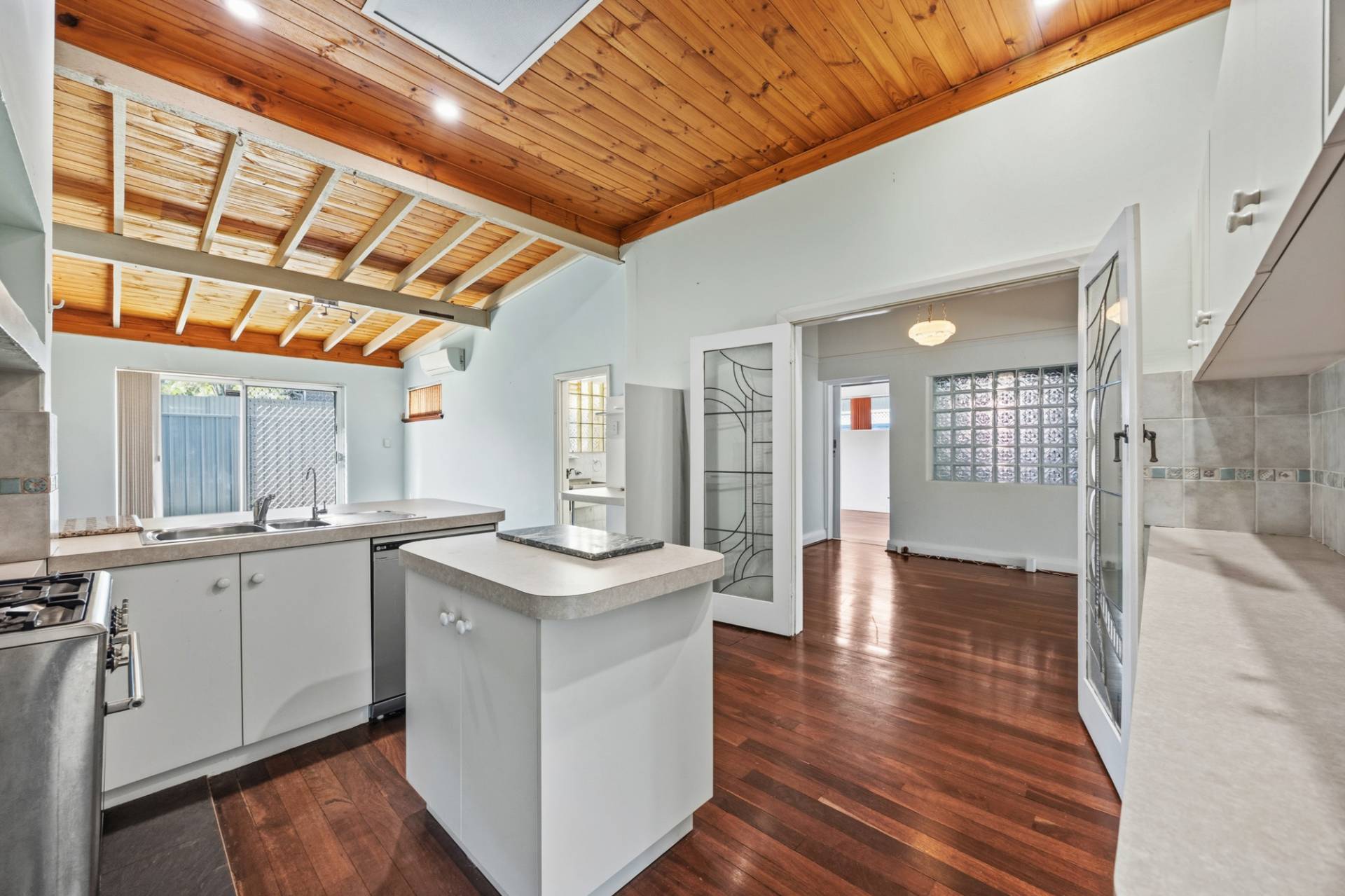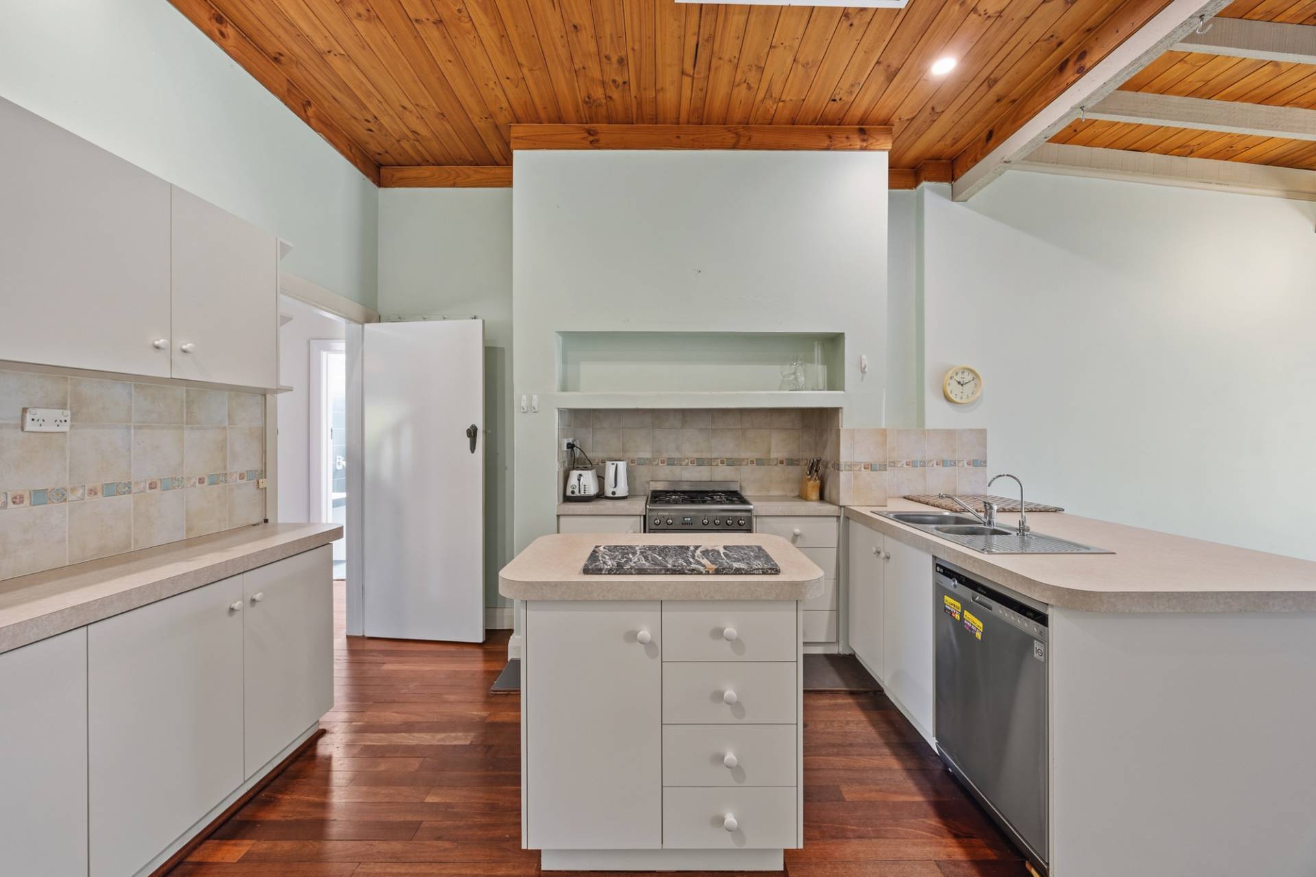 The main kitchen is well equipped with a gas cooktop and oven, dishwasher dual stainless-steel sinks, and a small island preparation area, complemented by ample cupboard storage throughout