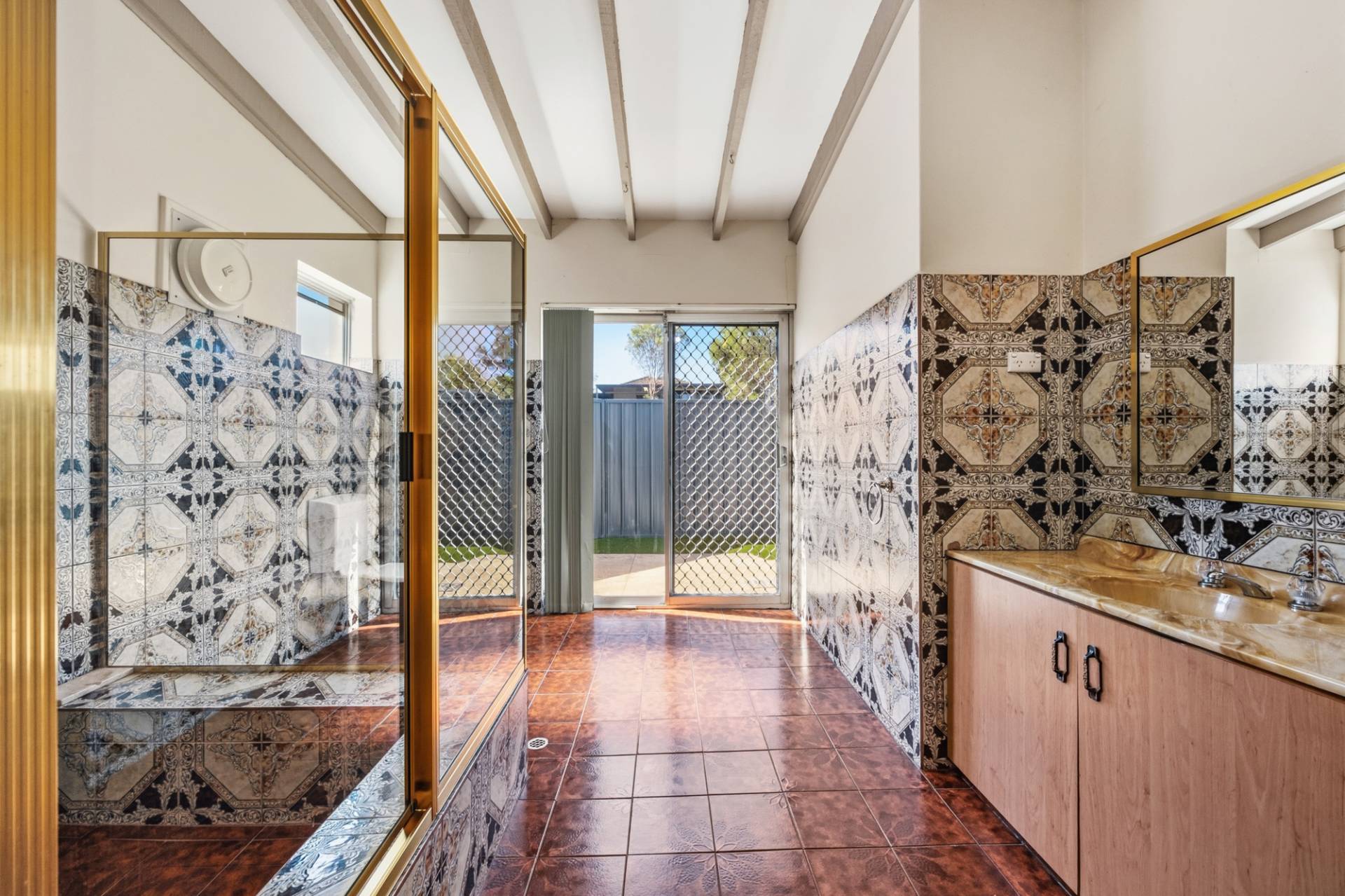 The ground level features the generous master bedroom, complete with ceiling fan, mirrored built-in robe and a large ensuite showcasing stylish wall tiles, shower, oversized vanity and toilet.