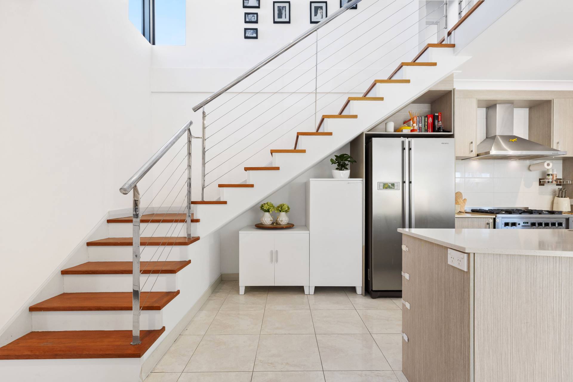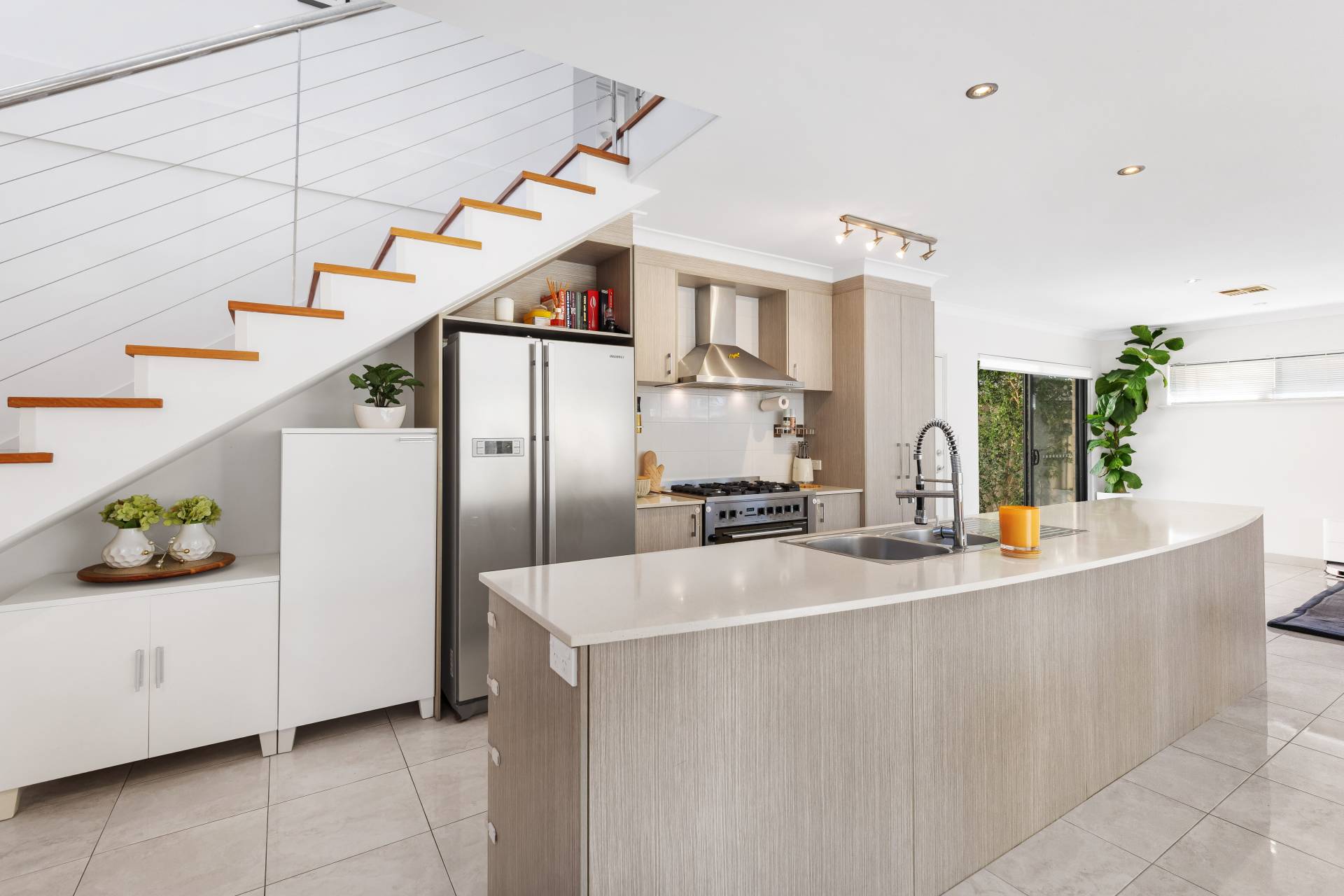 The tiled open plan living zone incorporates a fully fitted stone top kitchen with ample bench space and a freestanding 900mm European gas cooktop/oven, a dining area, and a spacious family room that opens onto the north facing alfresco entertaining area. A stylish timber and steel staircase adds architectural interest to the bright heart of the home.