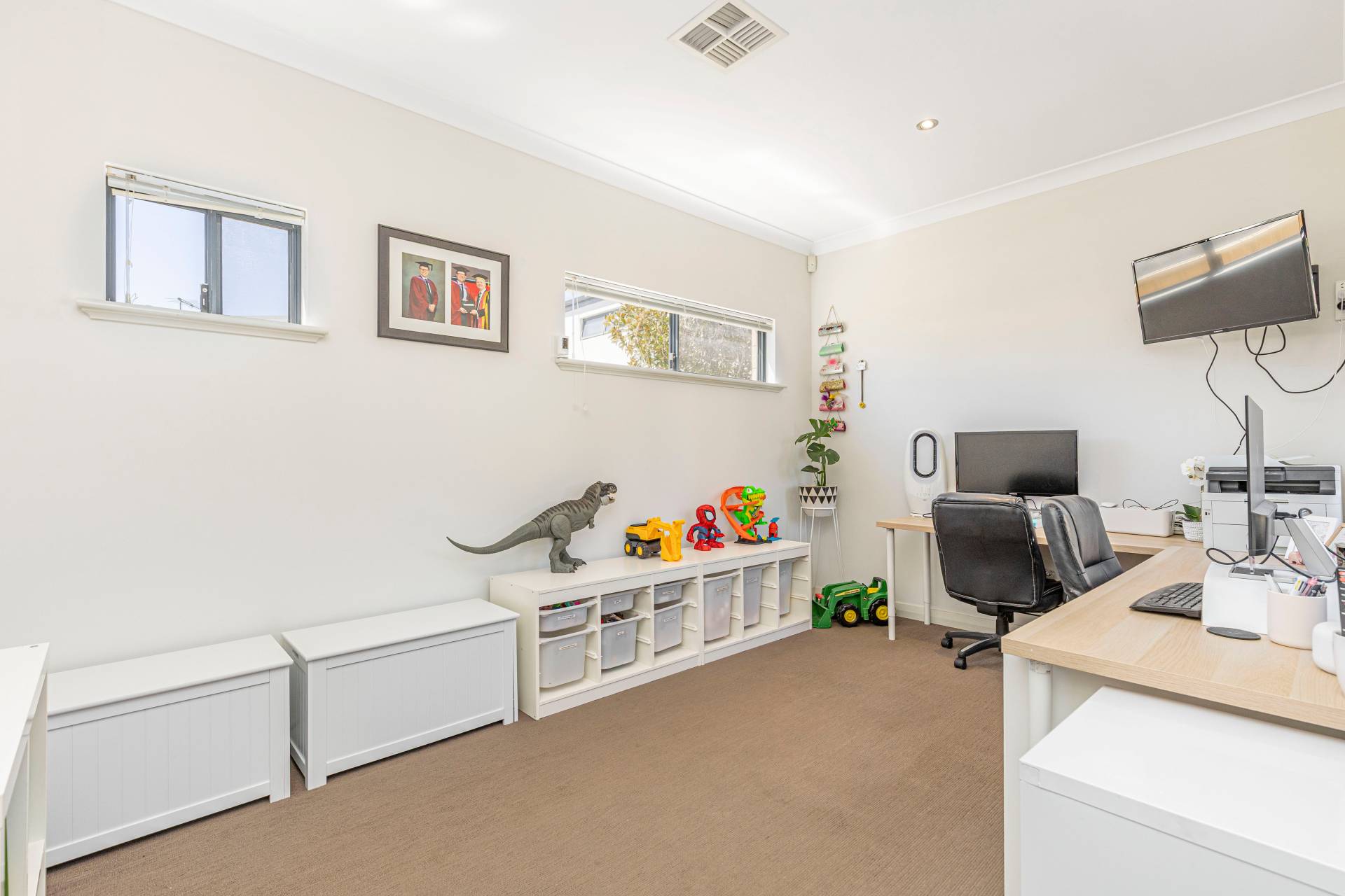 Positioned on a low maintenance rear lot with a gated driveway, the current owners of almost nine years have loved the friendly neighbourhood, the park directly across the road, and the home's generous, airy spaces. The floorplan effortlessly caters to everyday living, large family gatherings, and working from home, with a separate activity room/home office ideally located at the front entry.