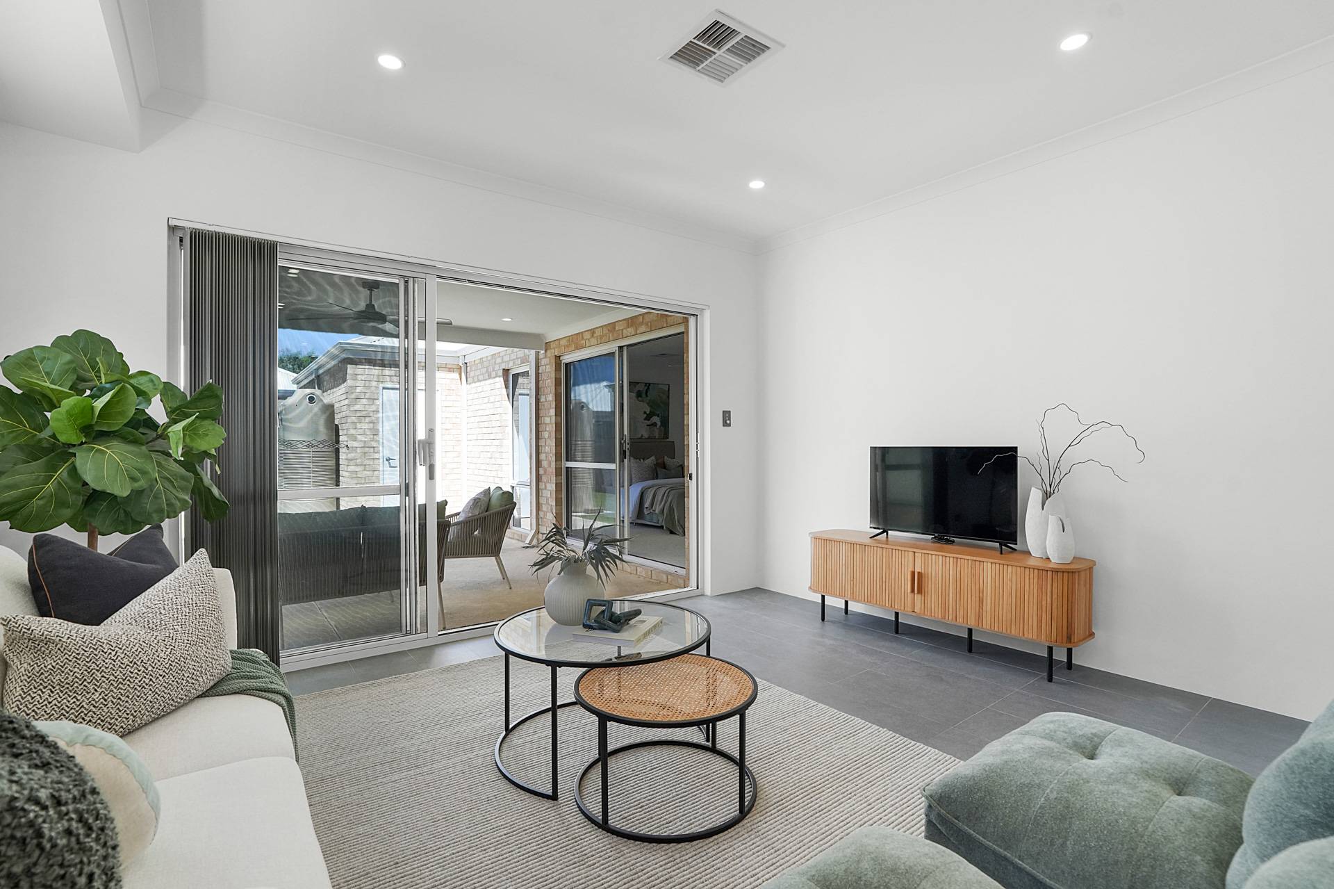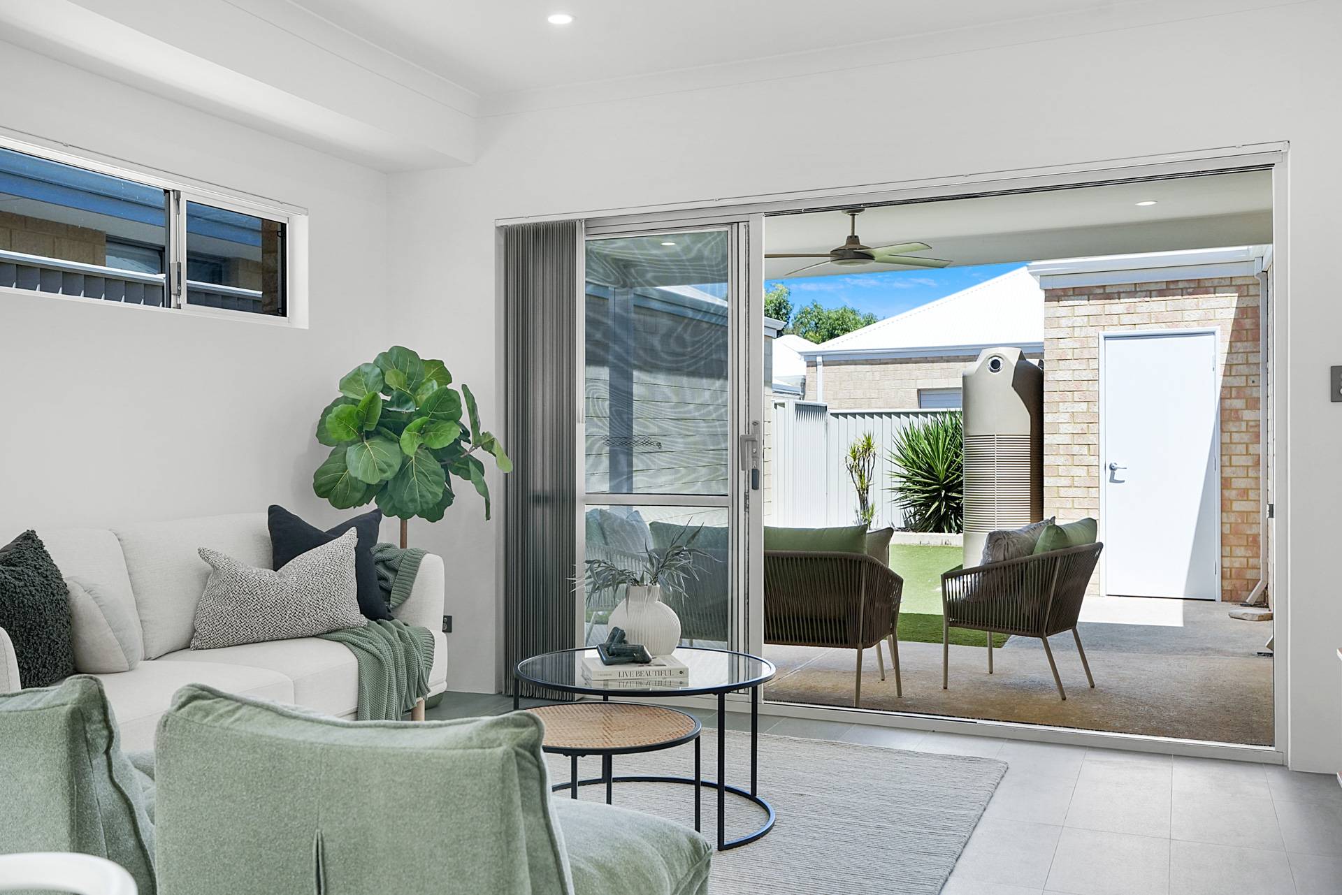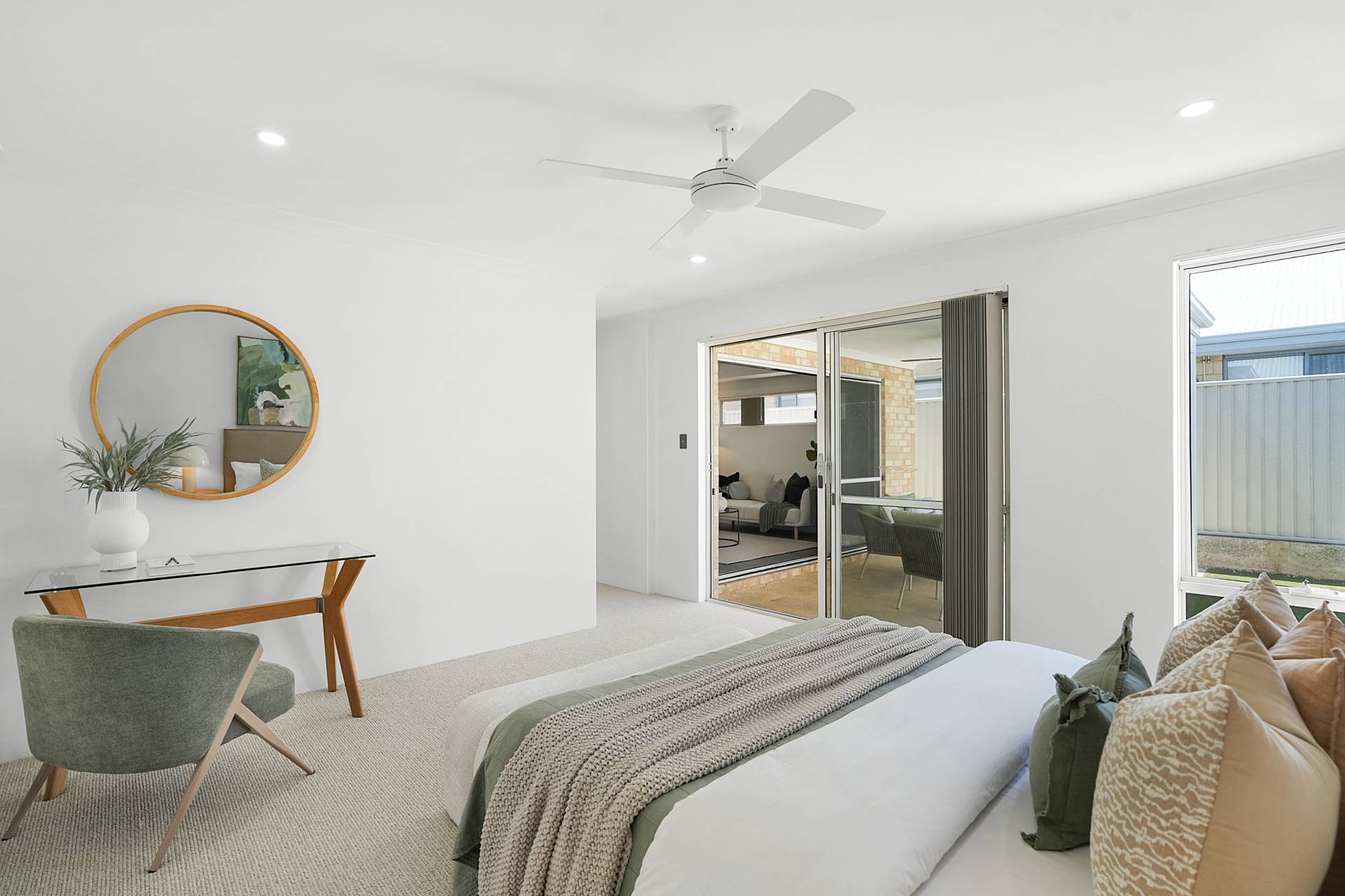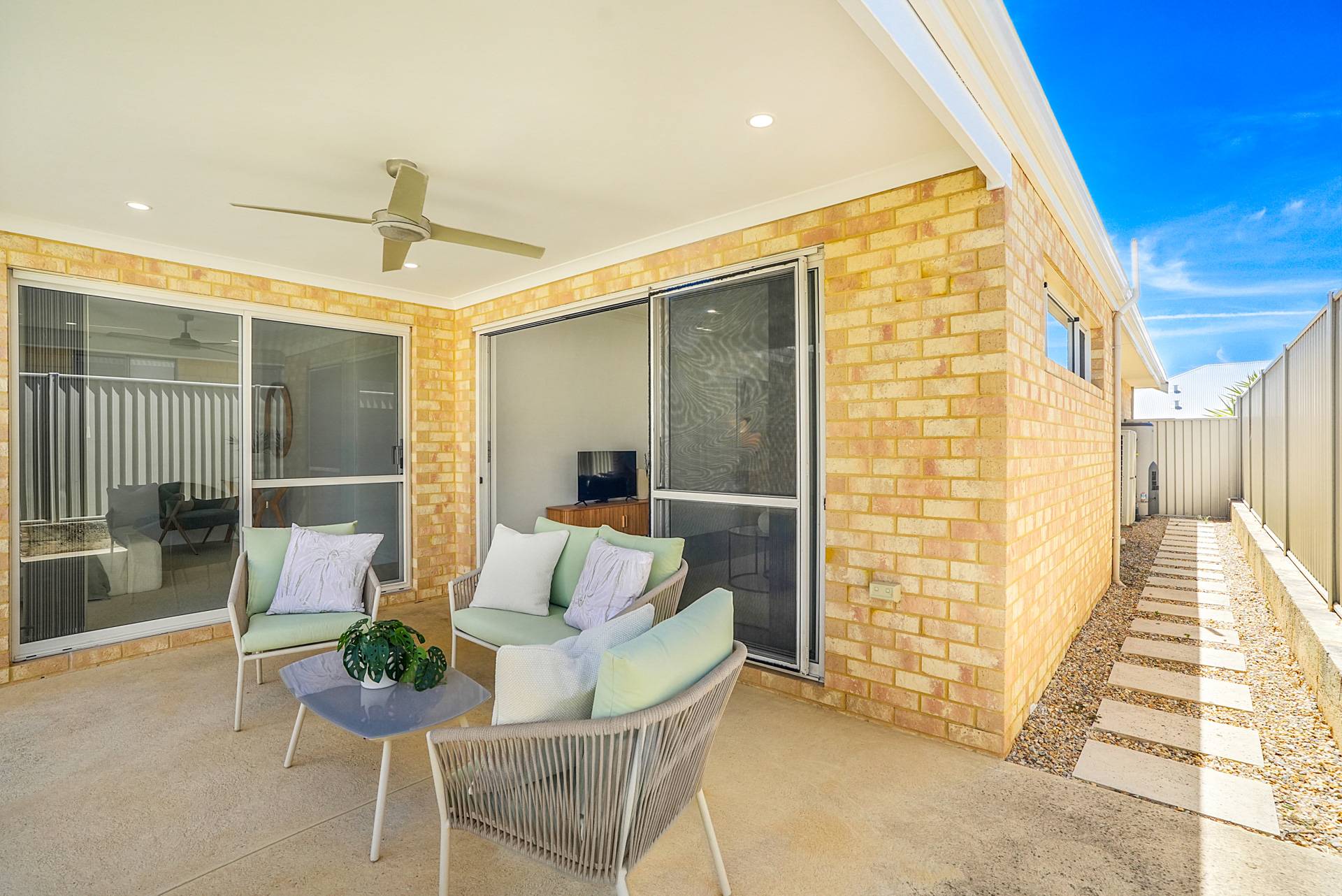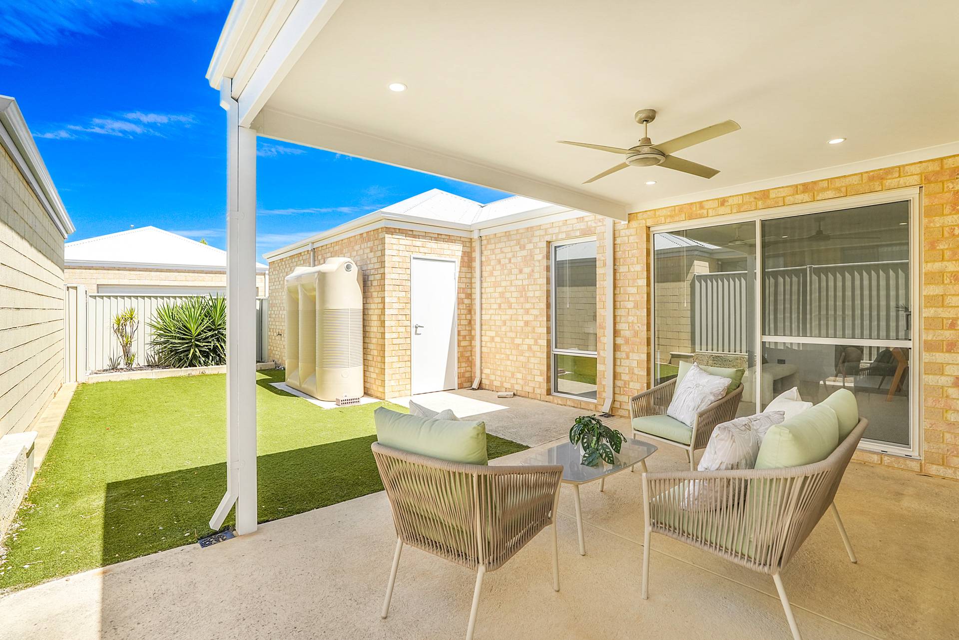 - Relaxing alfresco is under the main roof of the home and includes downlights and a fan