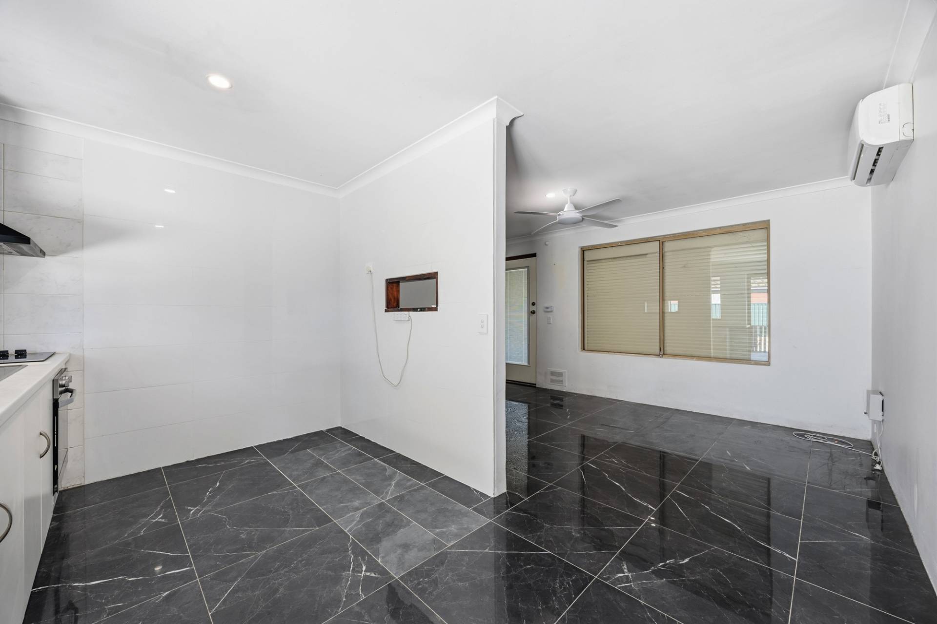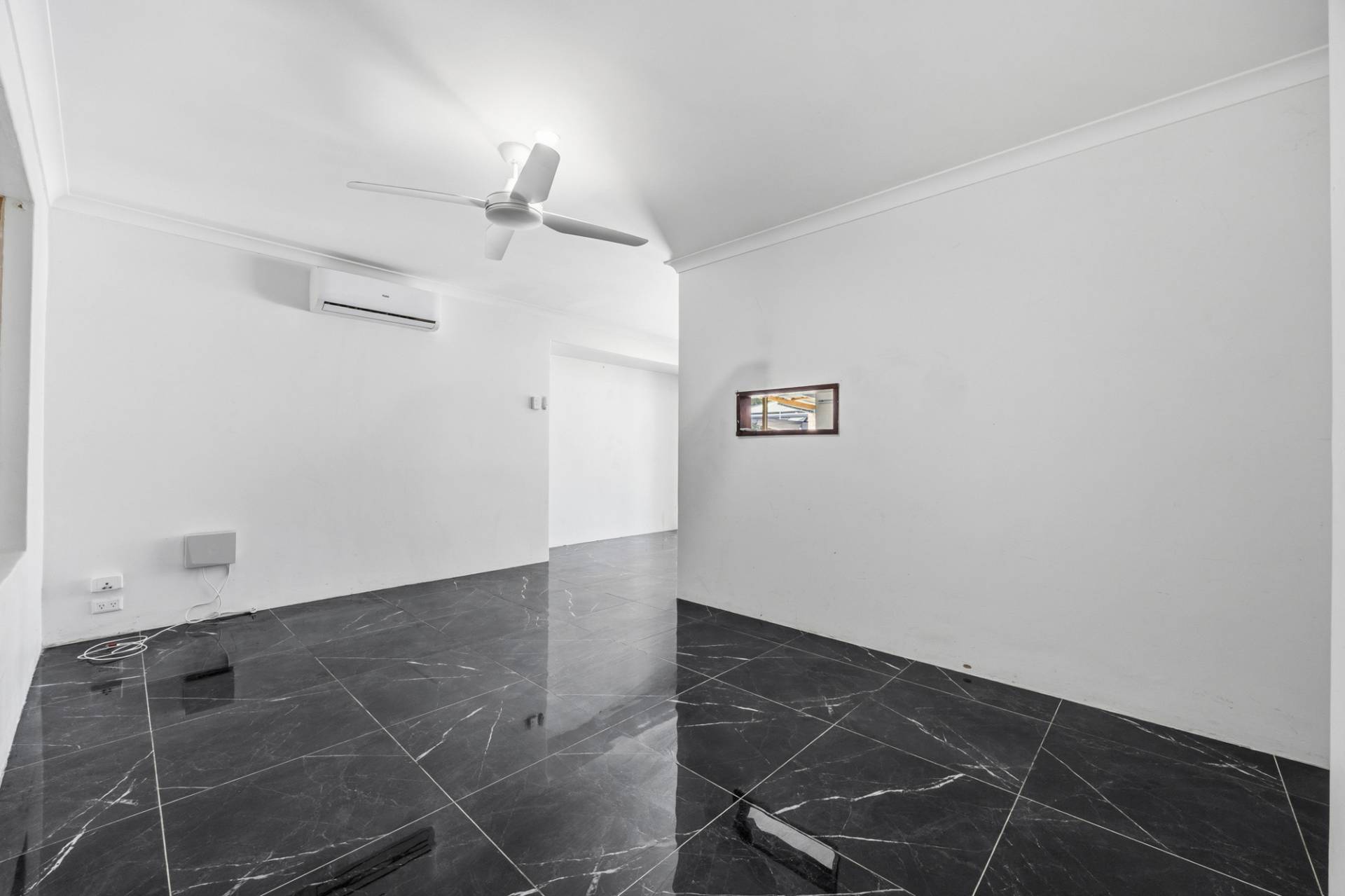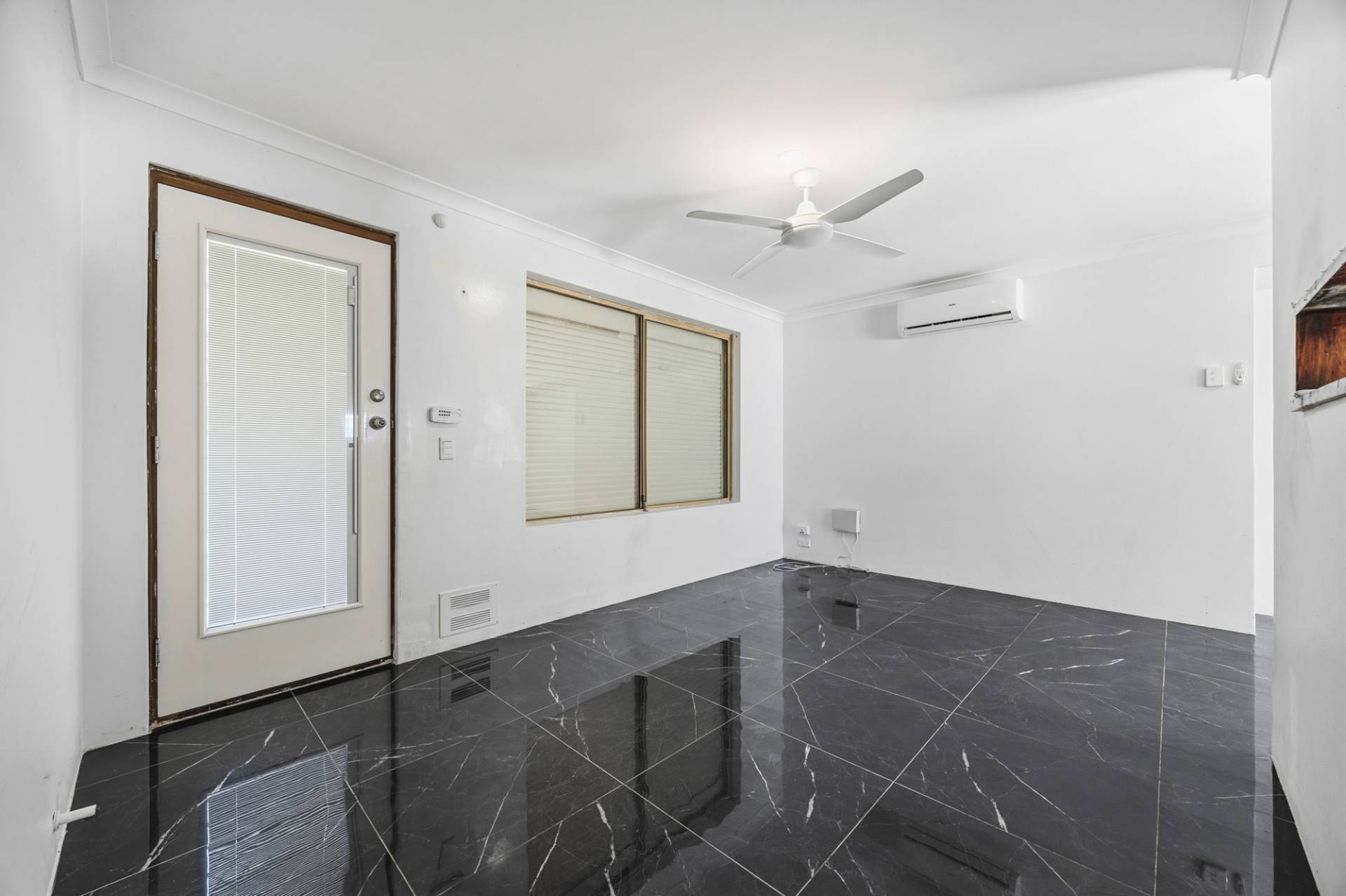 Main living area with ceiling fan and split system air conditioning