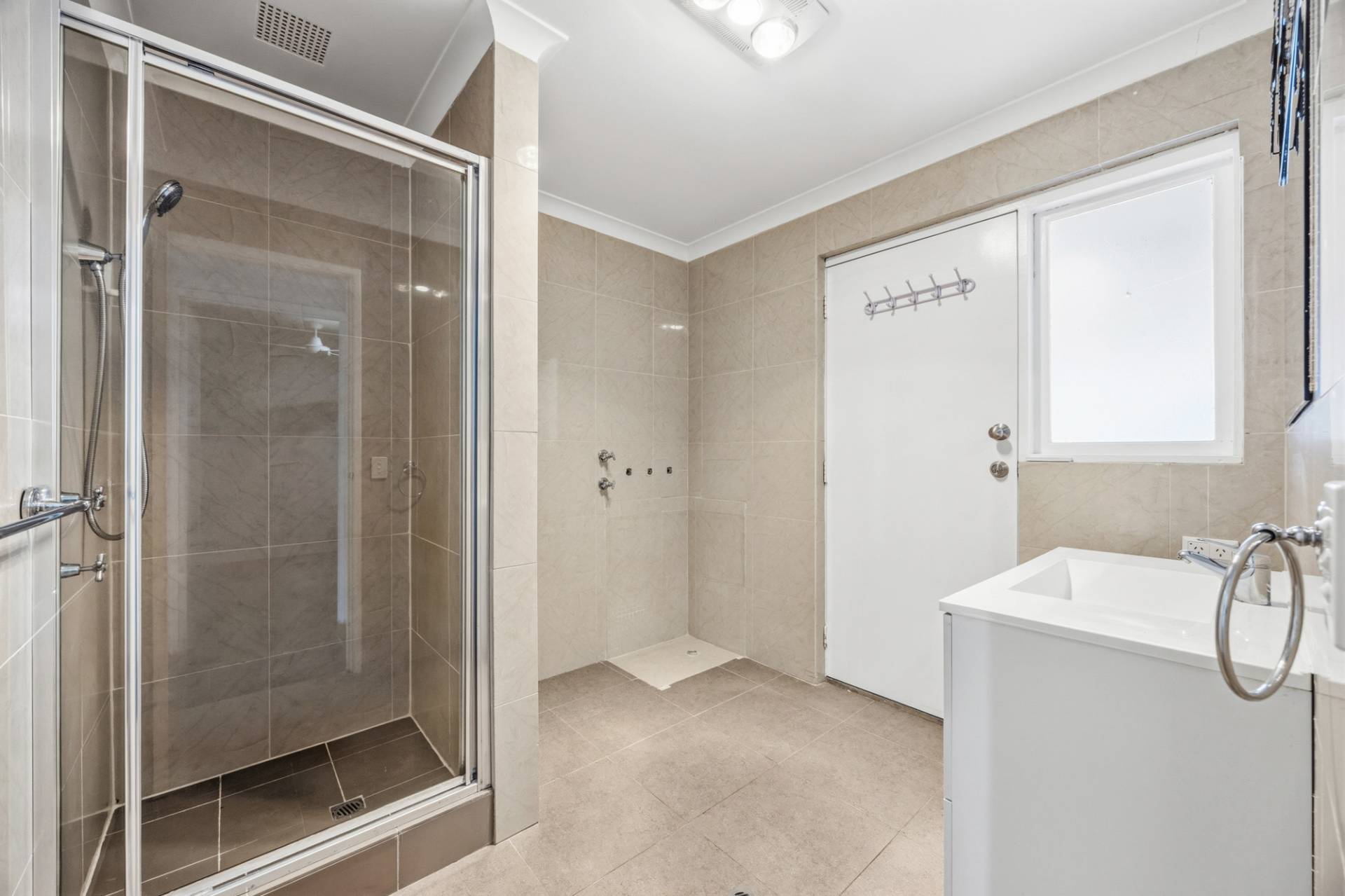 Combined bathroom and laundry with floor-to-ceiling tiles and heated lighting