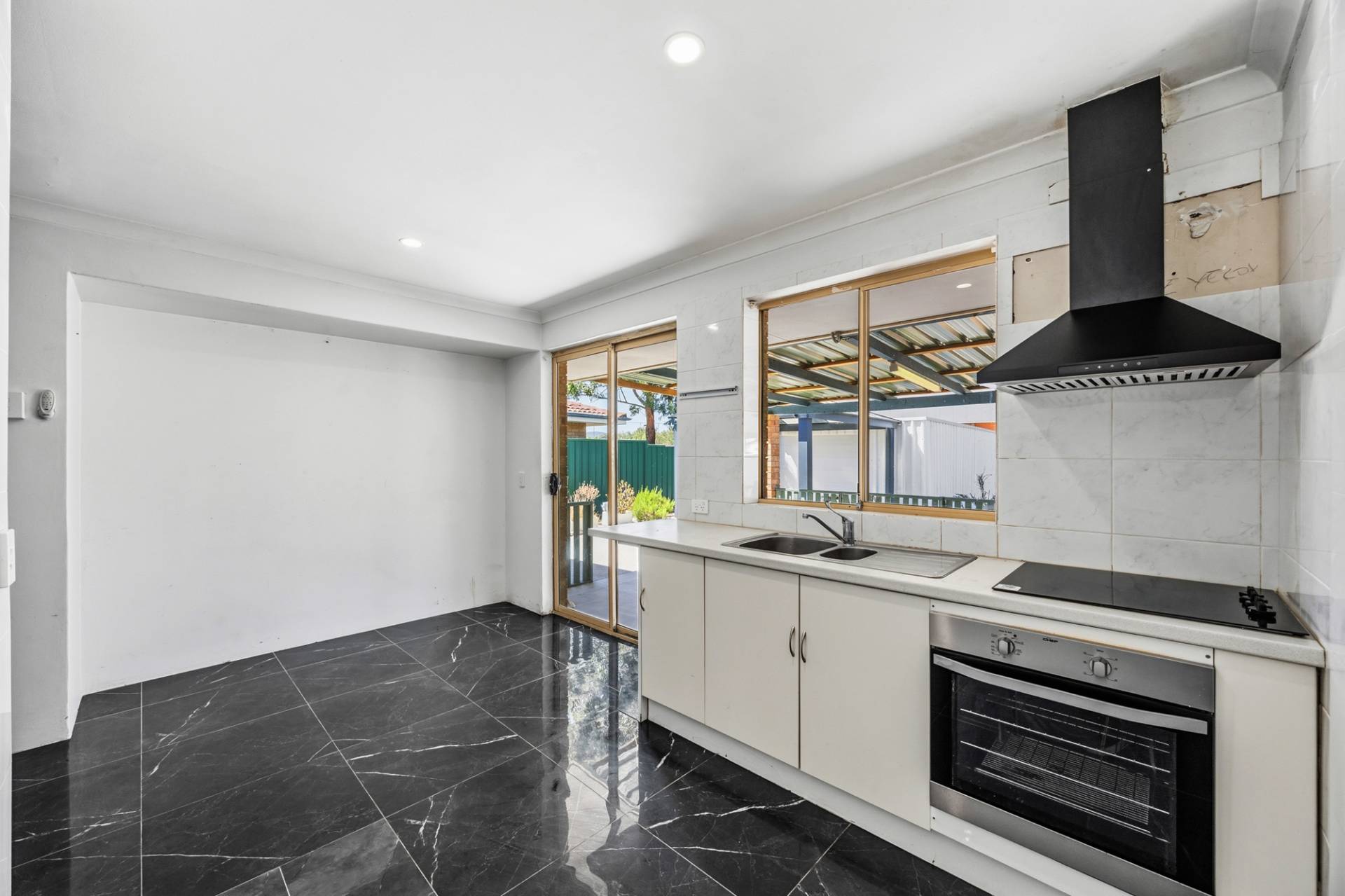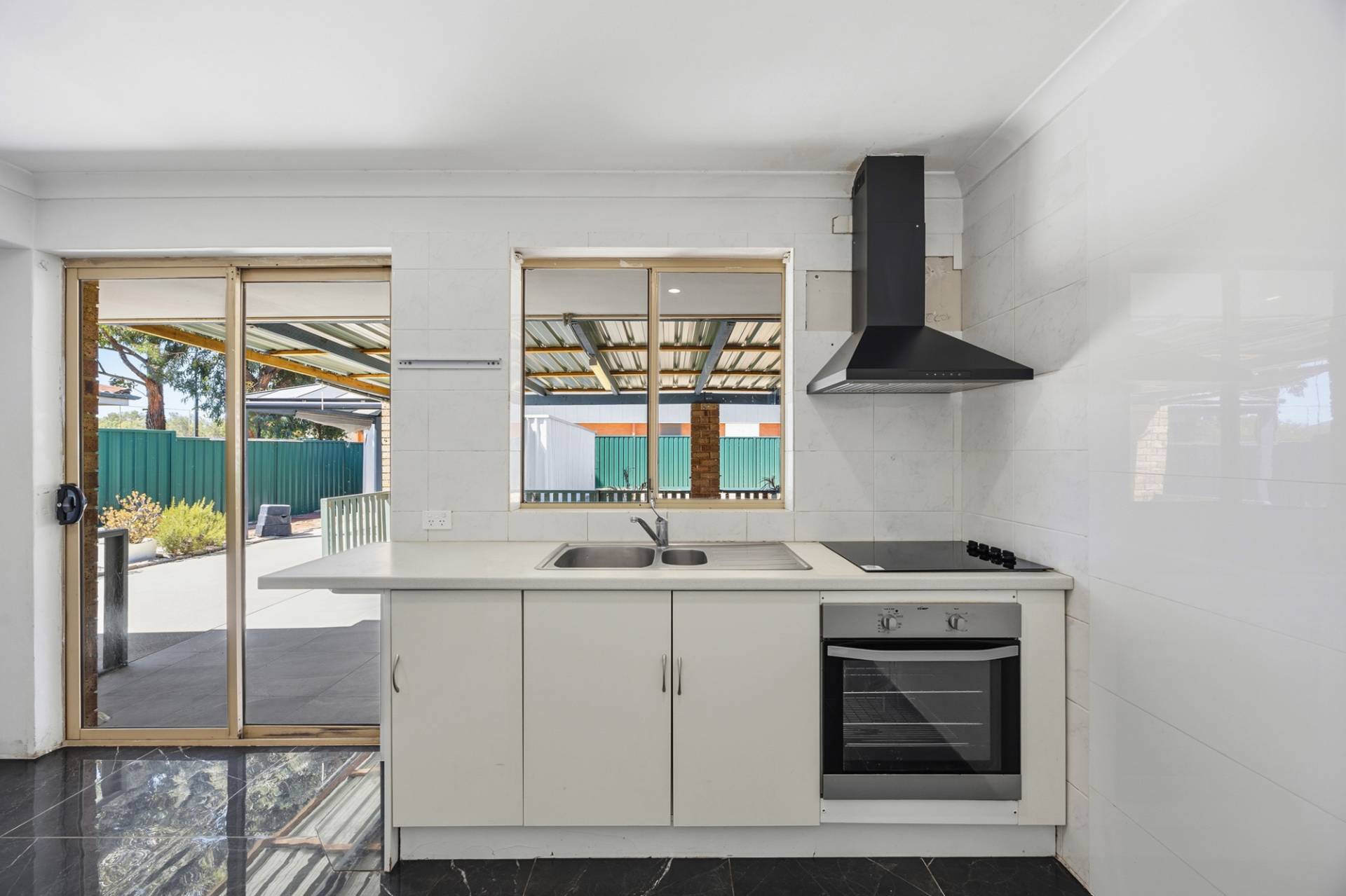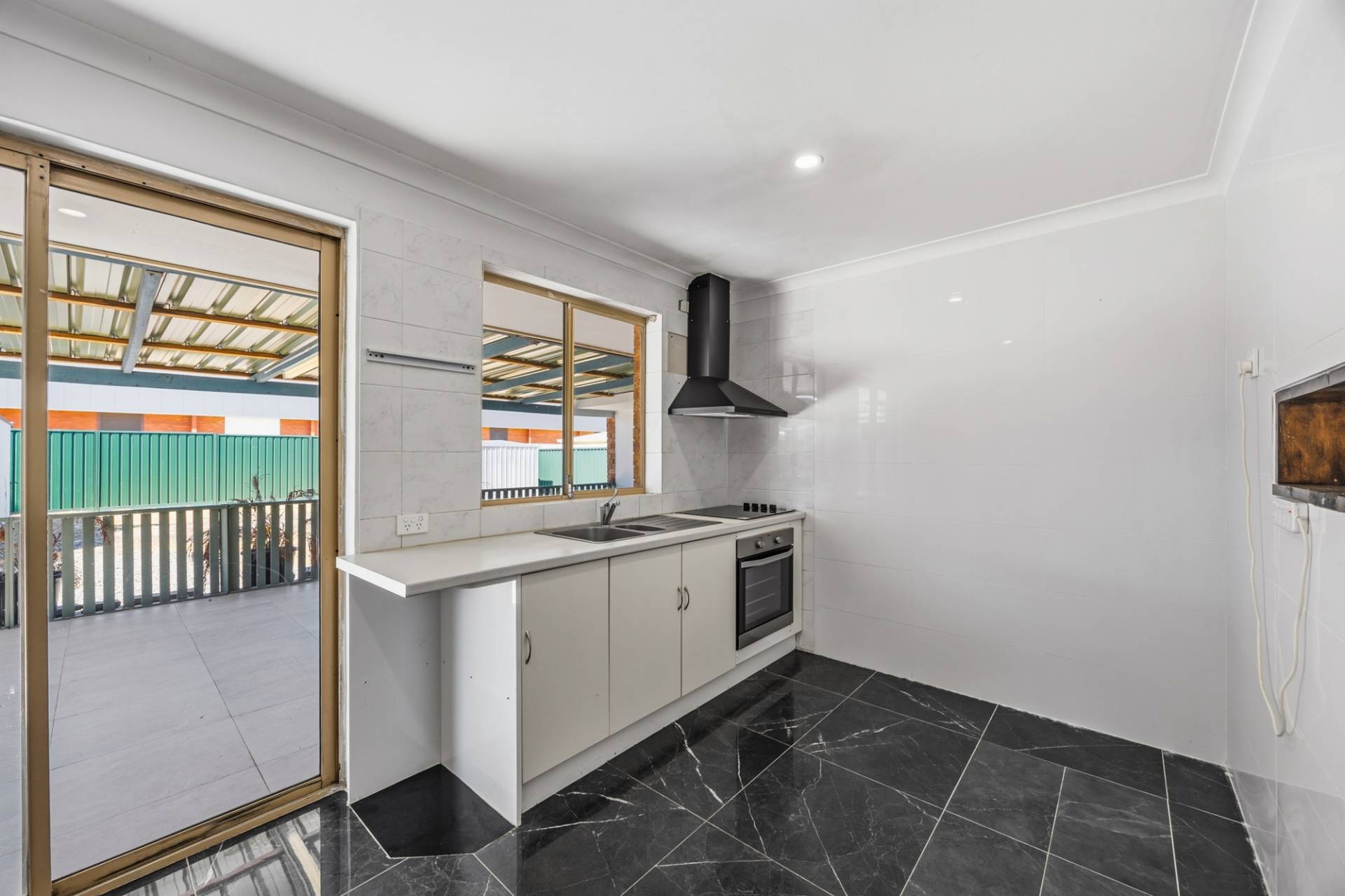 Kitchen with electric stove, oven, and rangehood, opening onto a large covered outdoor area