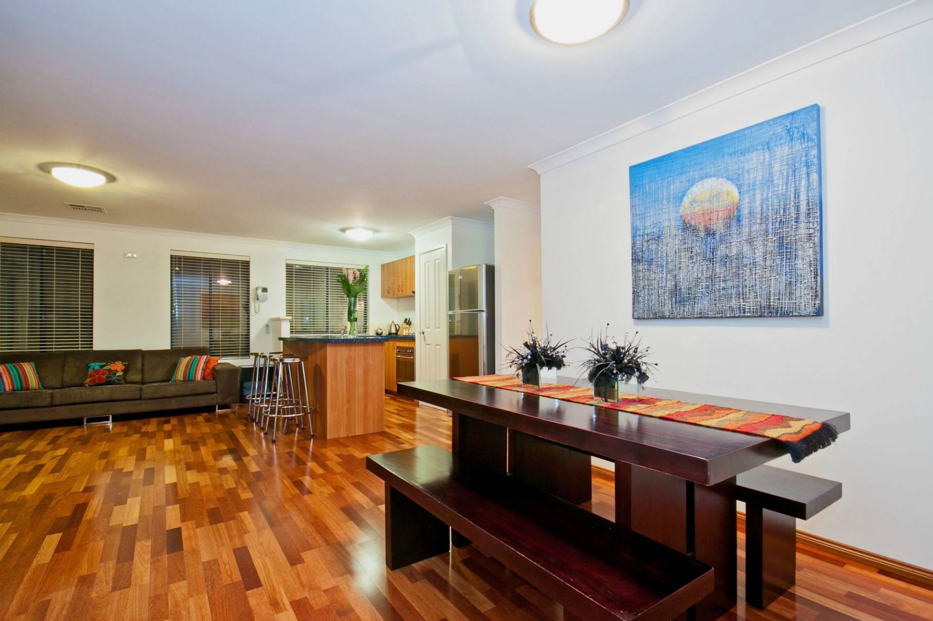 The open plan living is floored with glistening timber boards under a kitchen with plenty of solid Corian benches including island and generous cupboard space.