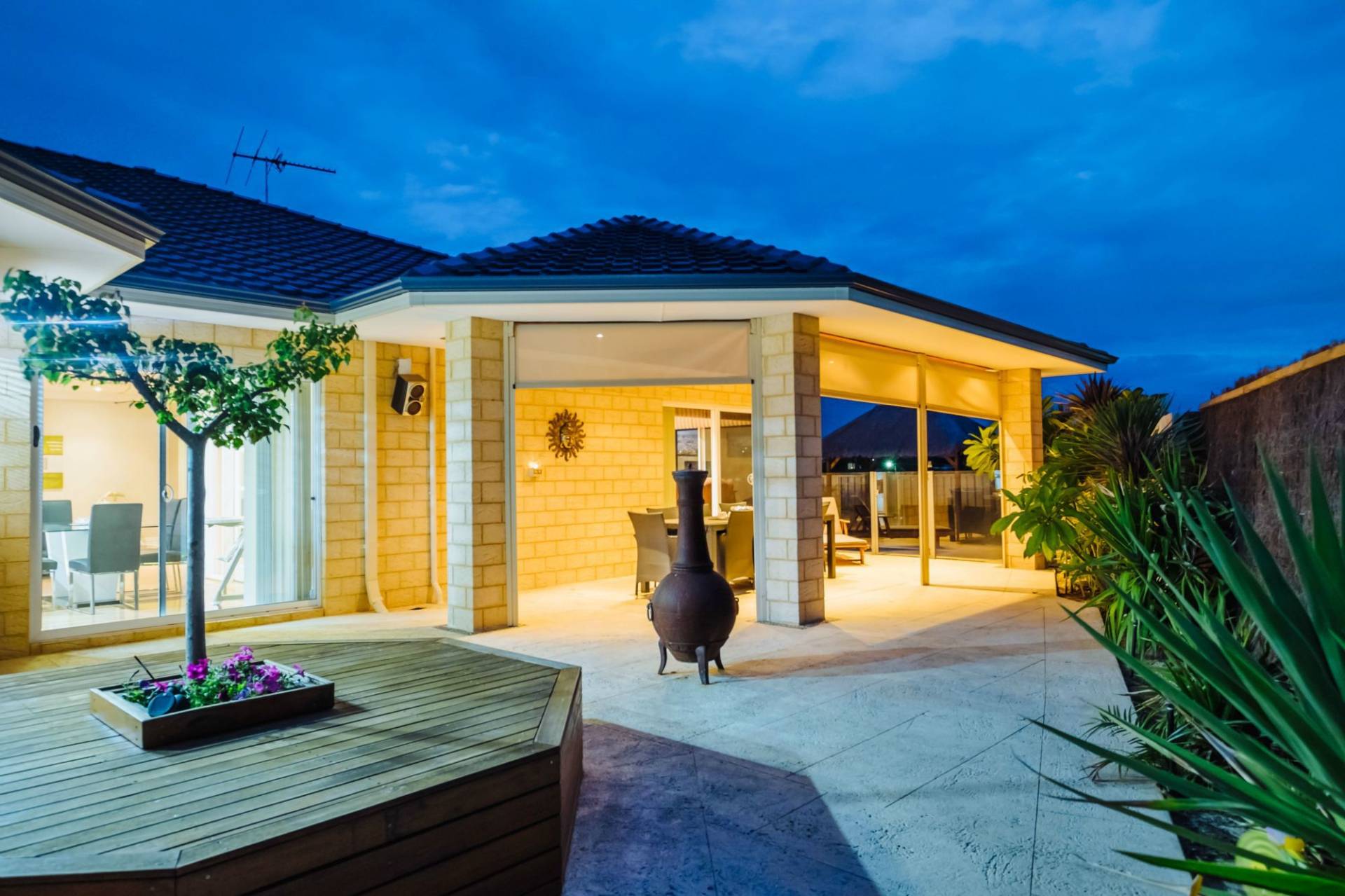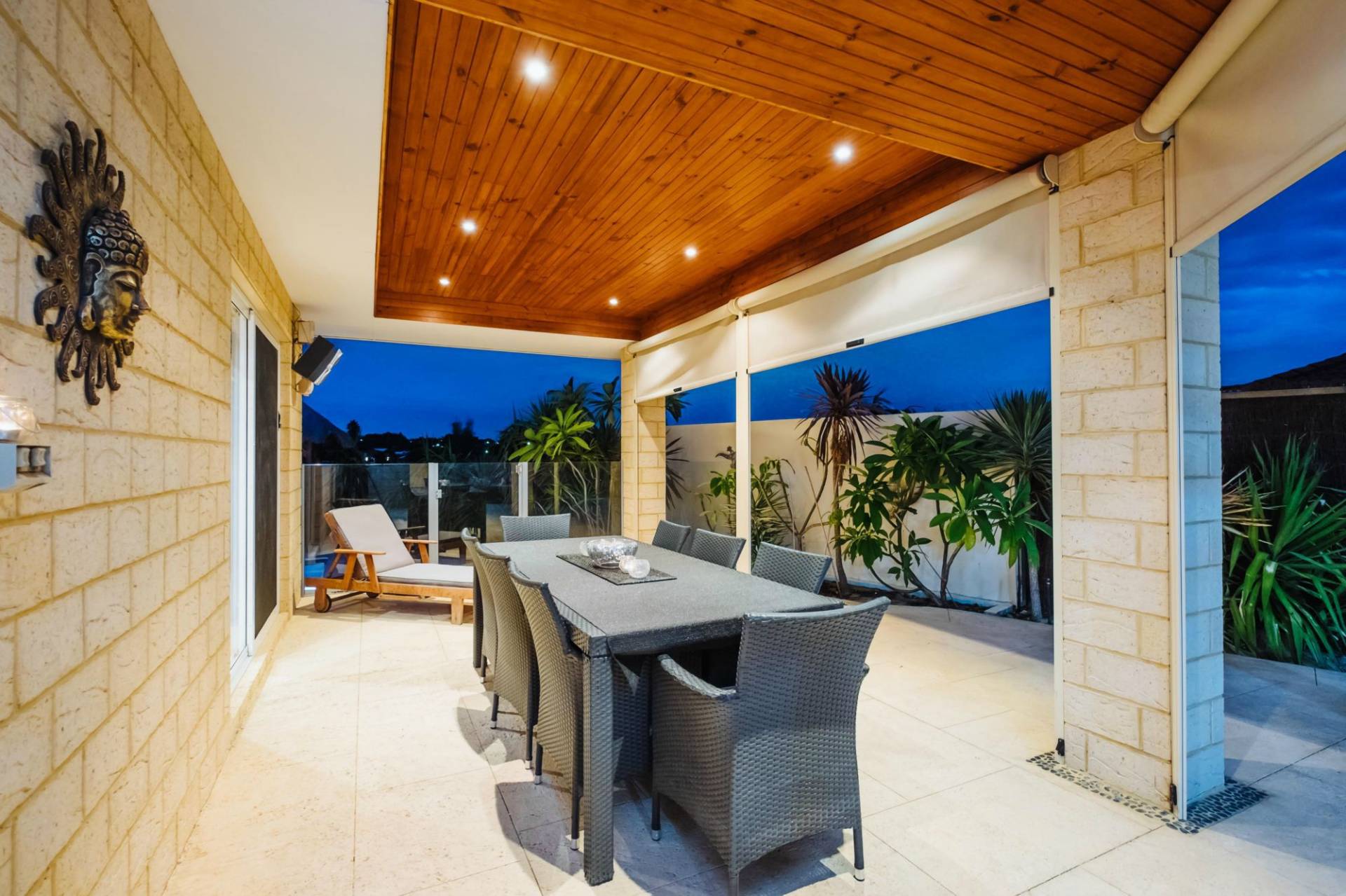 Outdoors the alfresco area is complete with cafe blinds and overlooks the pool in this low maintenance yard that looks beautiful and takes no effort to keep that way.