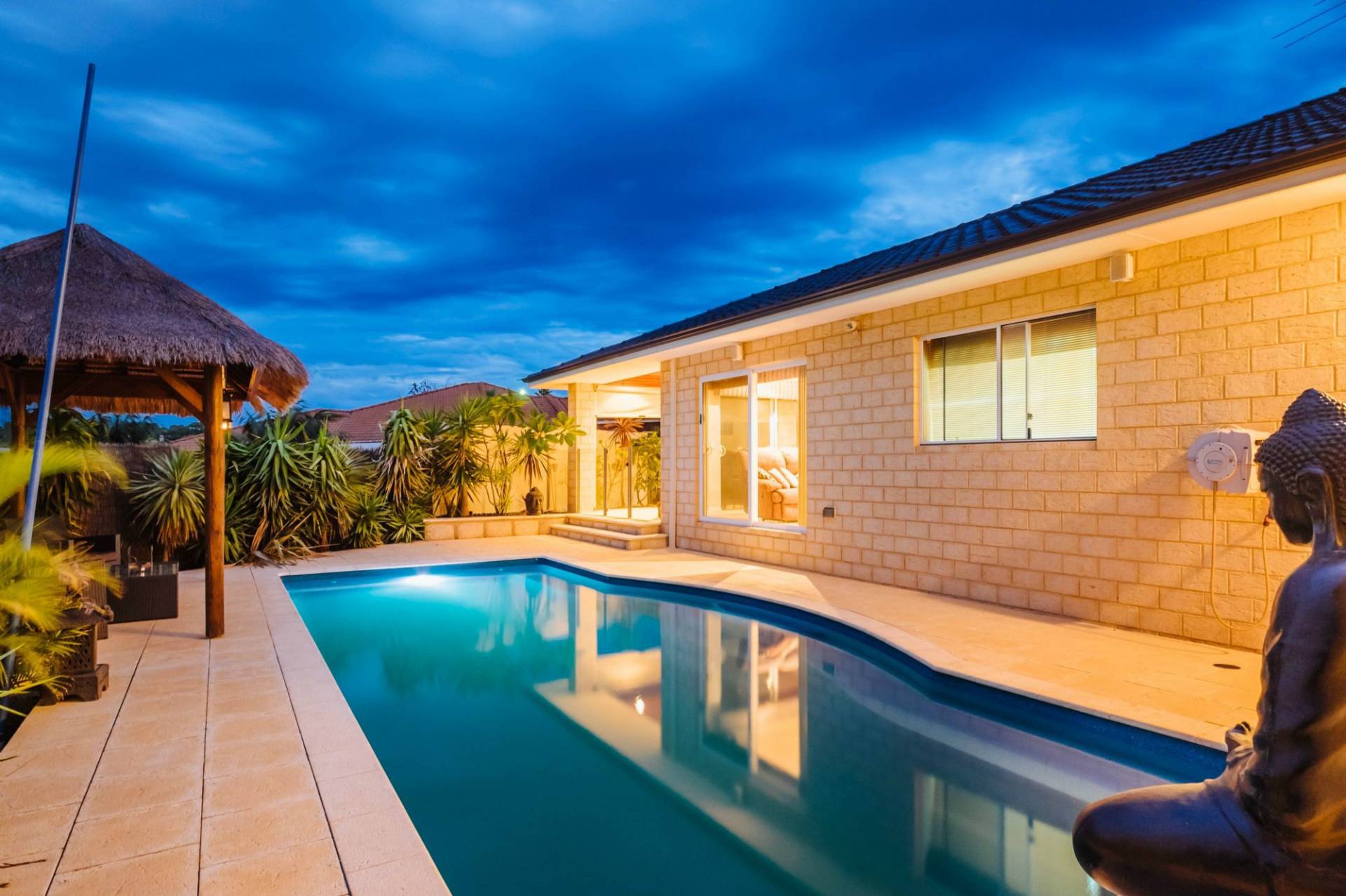 Bali thatched gazebo over looks the pool at one end and at the other a solid studio/gym facility built in the same materials as the rest of the house provides another area either for storage or hobbies.
