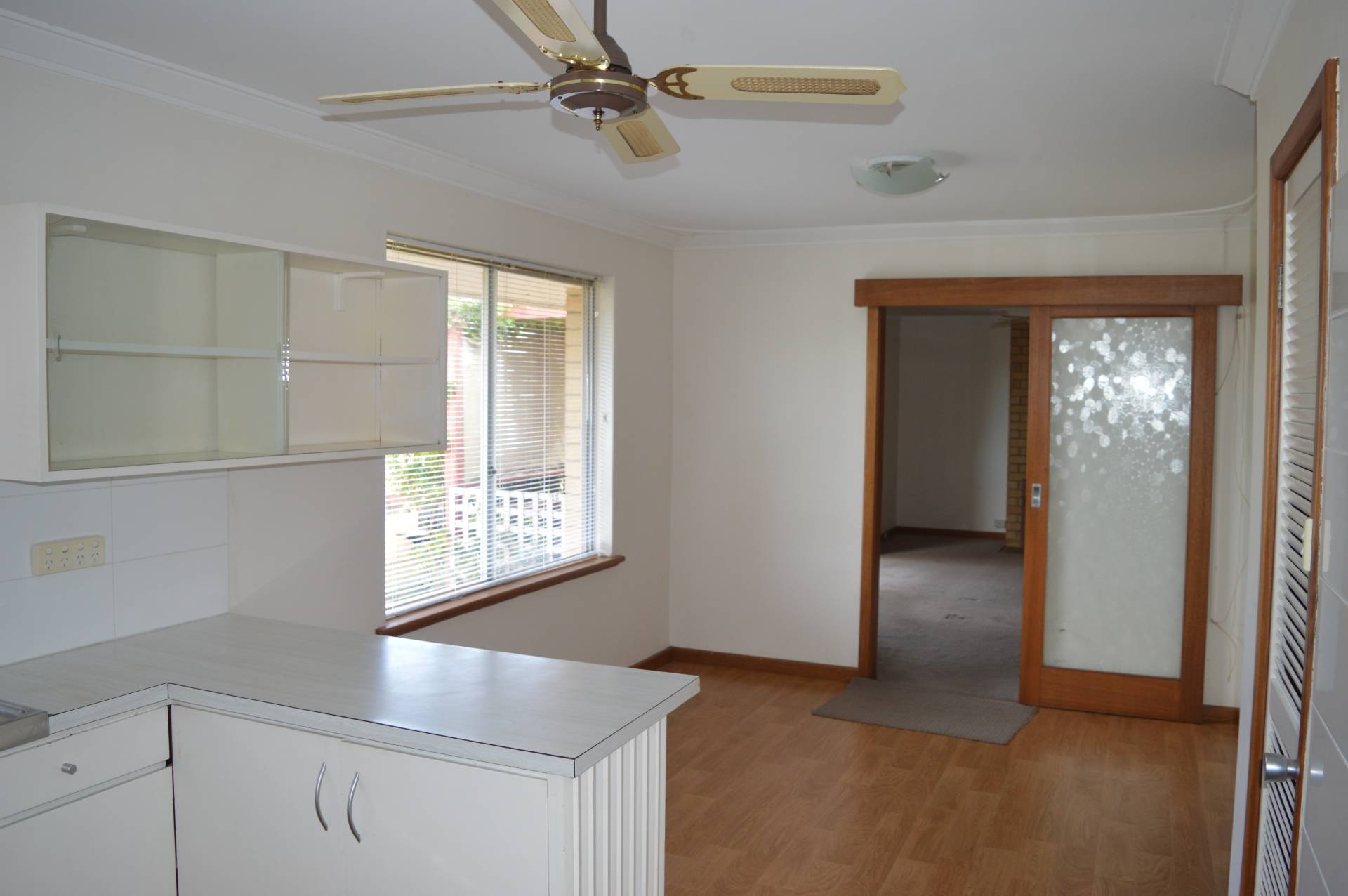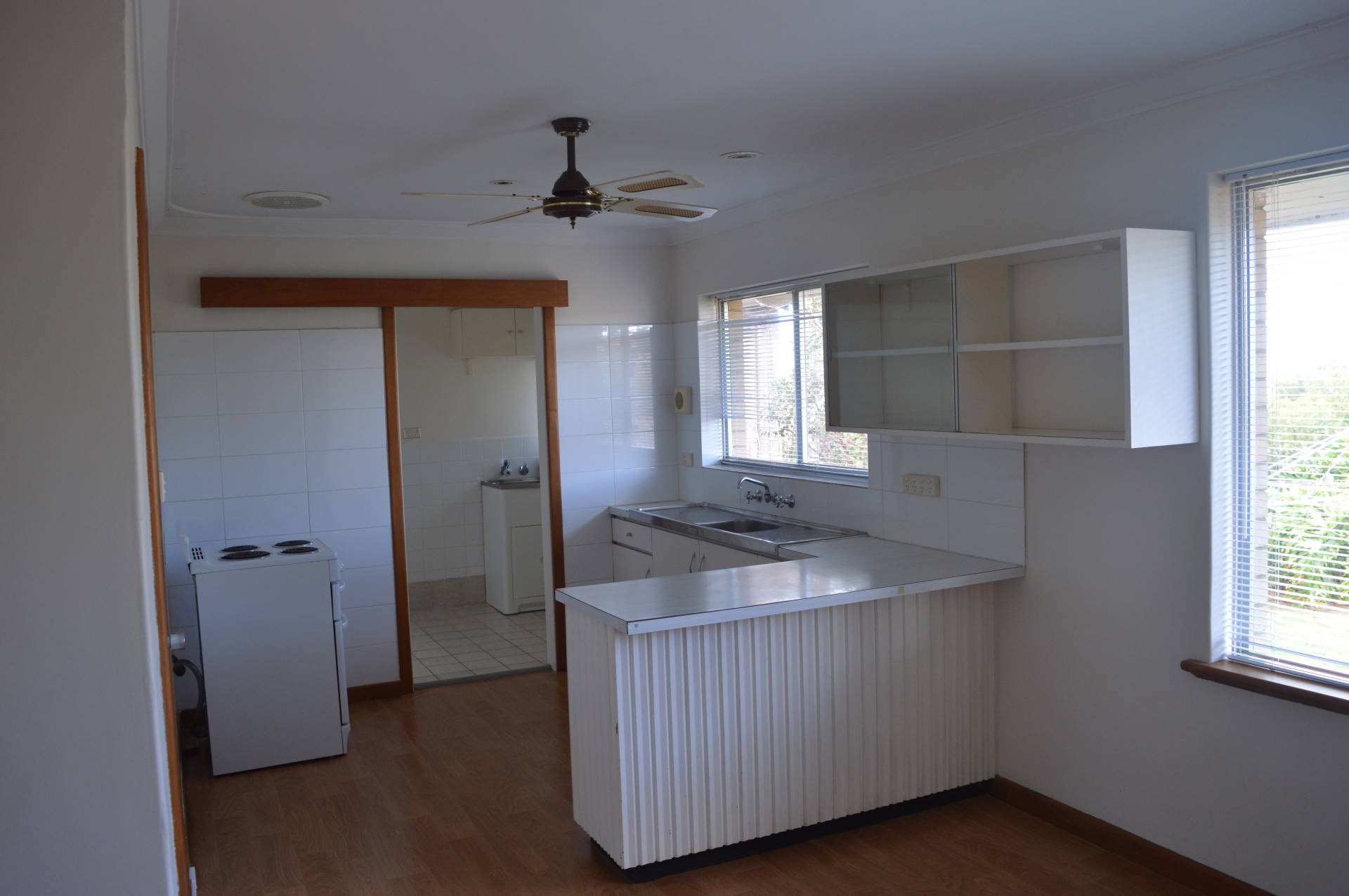 The kitchen is filled with natural light overlooking the HUGE backyard & has open plan to the dining area with a ceiling fan.