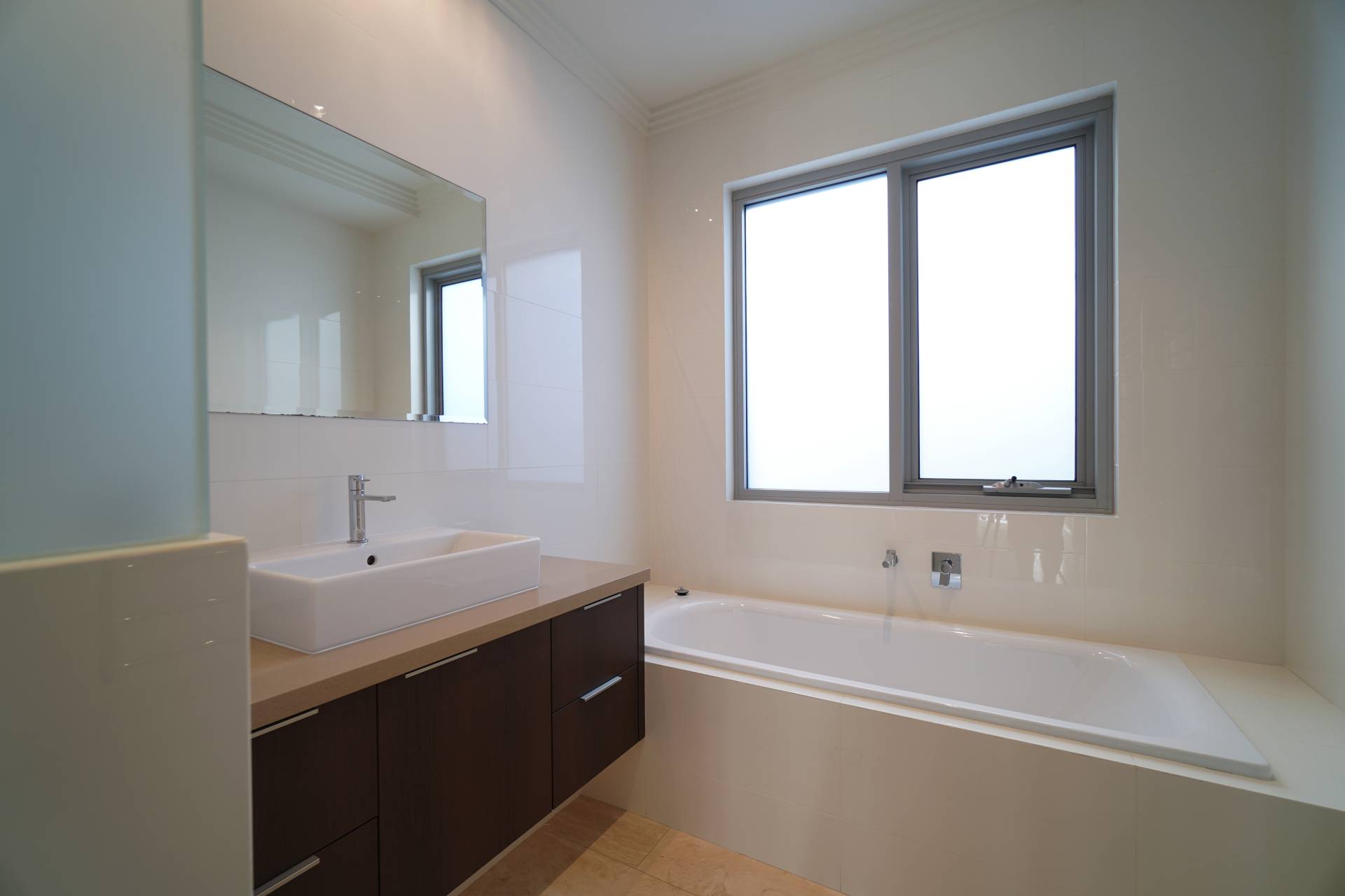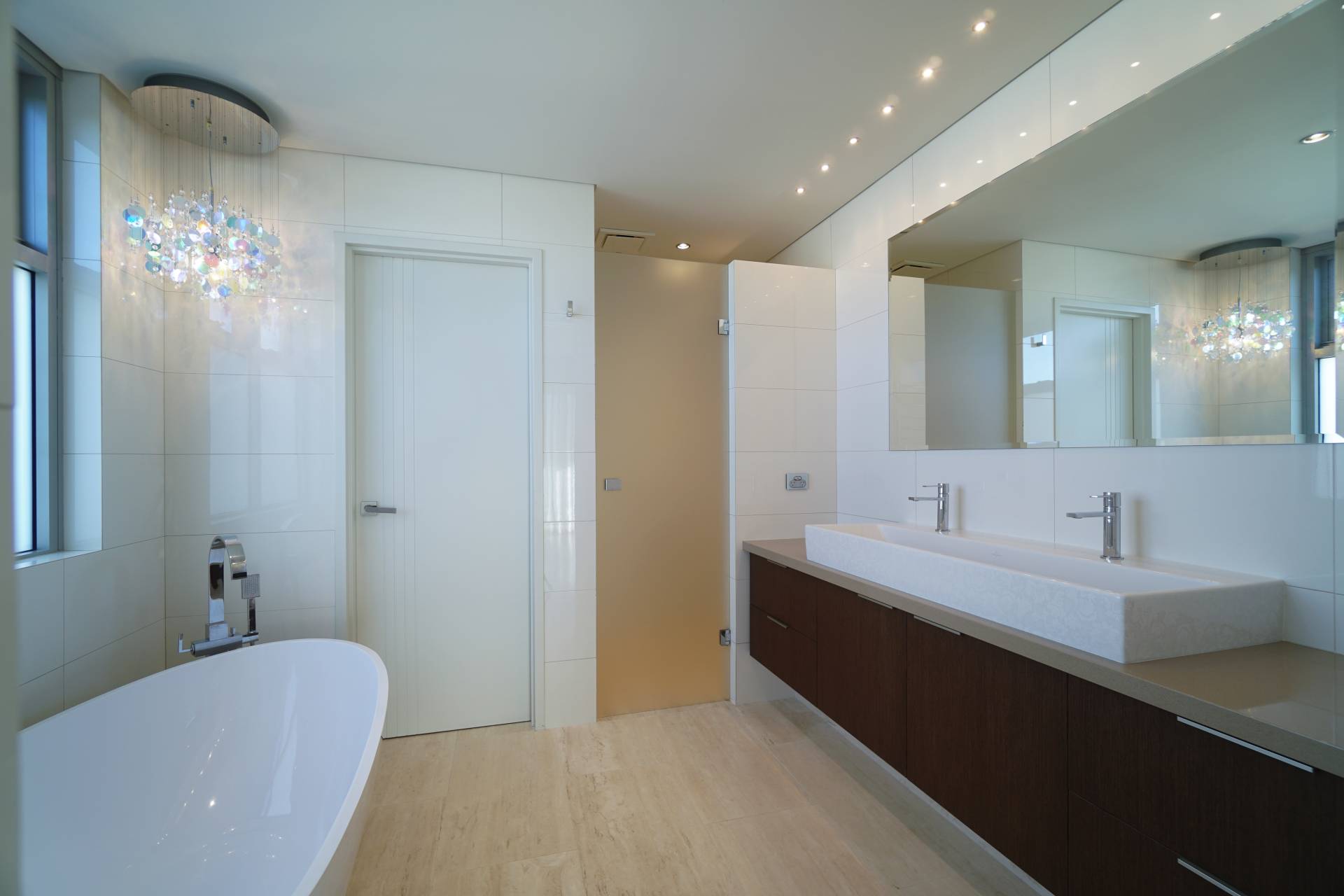 - Main bathroom with vanity, built-in bath and shower