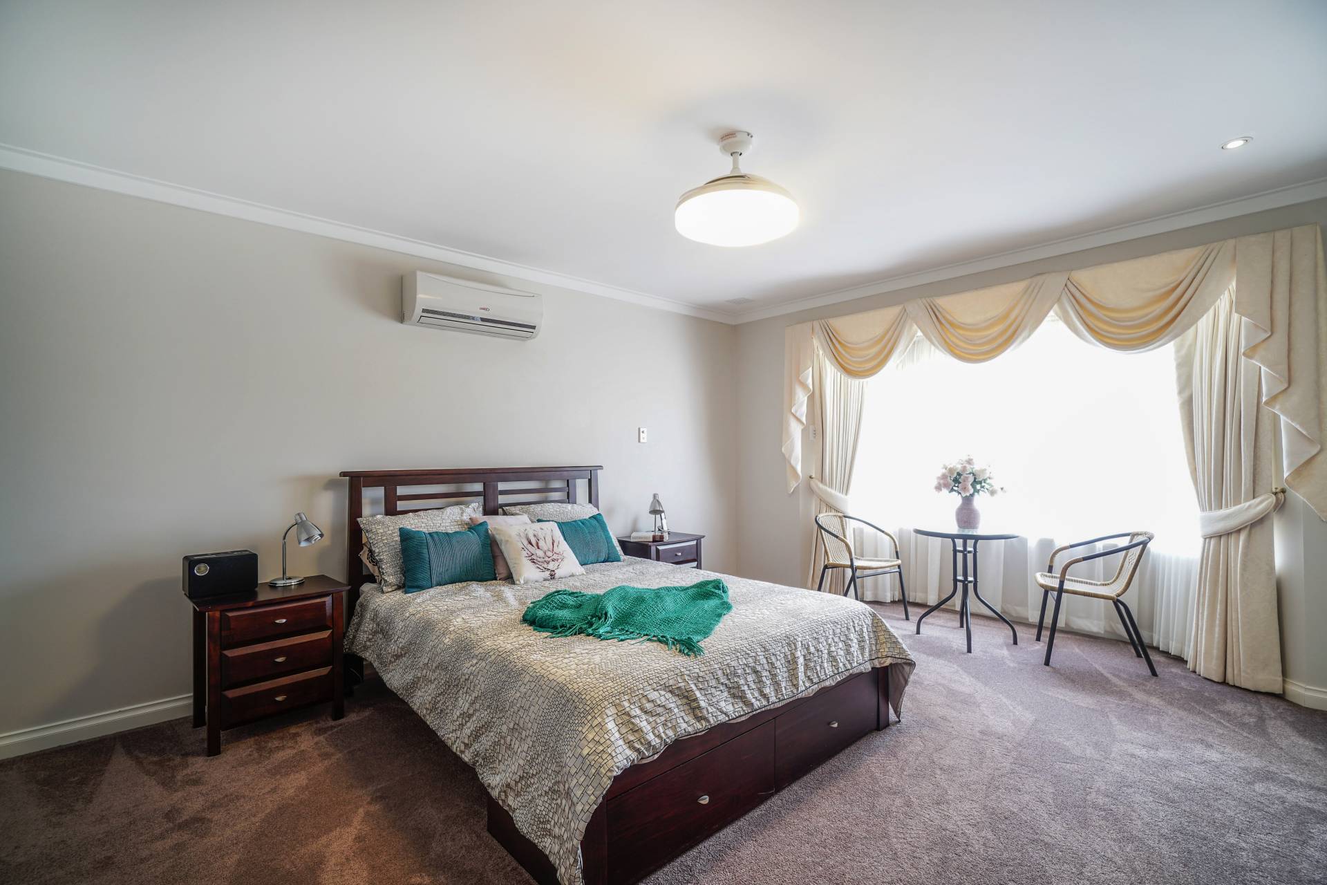 The master bedroom suite at the front of the home is also light and bright, with lovely window treatments, split system A/C, a generous ensuite featuring floor to ceiling tiling, and a walk in robe. The three minor bedrooms all have built in robes.