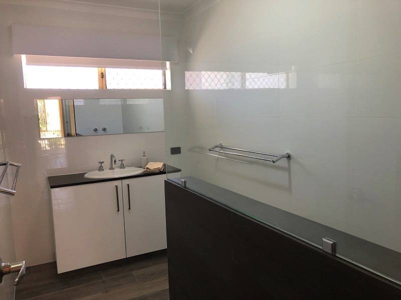 - Modern bathroom complete with vanity, feature stone blade bordering shower