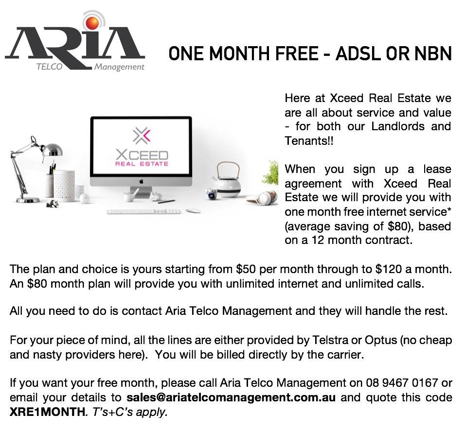 In addition to the above, XceedRE will provide you with 1 MONTH FREE internet service through Aria Telco Management – this is an average savings of $80! The plan and choice are all yours and all you will need to do is contact Aria Telco Management and they will handle the rest.
